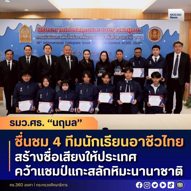 15 มกราคม 2569 – ศาสตราจารย์นฤมล ภิญโญสินวัฒน์ รัฐมนตรีว่าการกระทรวงศึกษาธิการ เป็นประธานในพิธีประกาศเกียรติคุณและมอบรางวัลแก่ นักเรียน นักศึกษาอาชีวศึกษาไทย ผู้ชนะการแข่งขัน 18th International Collegiate Snow Sculpture Contest เพื่อเชิดชูเกียรติและแสดงความยินดีกับความสำเร็จ ที่สร้างชื่อเสียงให้แก่ประเทศชาติบนเวทีนานาชาติ ณ สำนักงานคณะกรรมการการอาชีวศึกษา