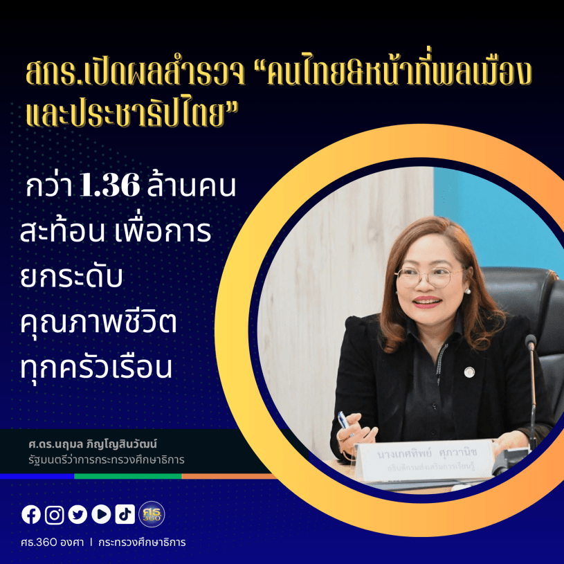 กรมส่งเสริมการเรียนรู้ กระทรวงศึกษาธิการ เปิดเผยผลการดำเนินงาน “โครงการส่งเสริมหน้าที่พลเมืองที่ดีและประชาธิปไตยในสังคมไทย” ซึ่งดำเนินการระหว่างเดือนพฤศจิกายน พ.ศ. 2568 ถึงมกราคม พ.ศ. 2569 ครอบคลุมพื้นที่กว่า 7,400 ตำบลทั่วประเทศ โดยมีการเก็บรวบรวมข้อมูลเชิงสถิติจากประชาชนรวมทั้งสิ้น 1,362,902 คน นับเป็นหนึ่งในฐานข้อมูลด้านพฤติกรรมและทัศนคติของพลเมืองที่มีขนาดใหญ่ที่สุดในช่วงหลายปีที่ผ่านมา และสะท้อนภาพรวมของการตื่นตัวทางการเมืองของสังคมไทยได้อย่างชัดเจน