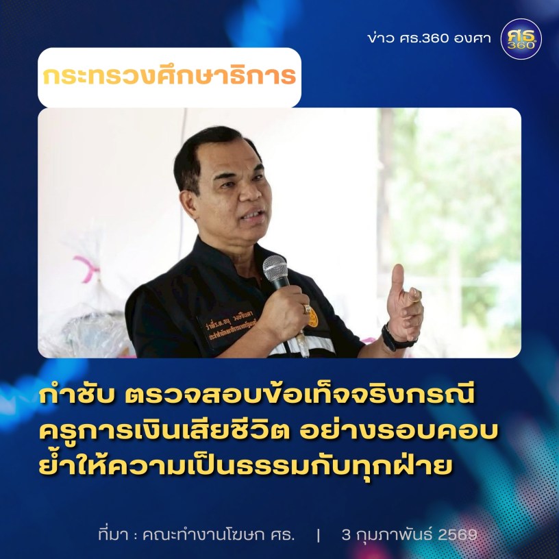 3 กุมภาพันธ์ 2569 / ว่าที่ร้อยตรี ธนุ วงษ์จินดา โฆษกกระทรวงศึกษาธิการ เปิดเผยว่า กระทรวงศึกษาธิการรับทราบข้อมูลที่ปรากฏในสื่อสังคมออนไลน์และสื่อมวลชน กรณีการเสียชีวิตของข้าราชการครูผู้ปฏิบัติงานด้านการเงินในสถานศึกษาแห่งหนึ่ง ซึ่งเป็นเหตุการณ์ที่สร้างความสะเทือนใจแก่ครอบครัว ผู้ร่วมงาน และผู้ที่เกี่ยวข้อง