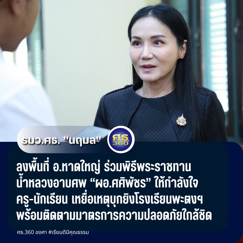เมื่อวันที่ 12 ก.พ. 2569 ศ.ดร.นฤมล ภิญโญสินวัฒน์ รัฐมนตรีว่าการกระทรวงศึกษาธิการ เดินทางลงพื้นที่จังหวัดสงขลา เพื่อร่วมพิธีพระราชทานน้ำหลวงอาบศพ นางศศิพัชร สินสโมสร ผู้อำนวยการโรงเรียนพะตงประธานคีรีวัฒน์ ณ วัดยูงทอง เพื่อแสดงความอาลัยและให้เกียรติแก่ผู้เสียชีวิต พร้อมทั้งเยี่ยมให้กำลังใจผู้ได้รับผลกระทบจากเหตุคนร้ายใช้อาวุธปืนที่ชิงมาจากตำรวจบุกเข้าไปก่อเหตุในโรงเรียนพะตงประธานคีรีวัฒน์