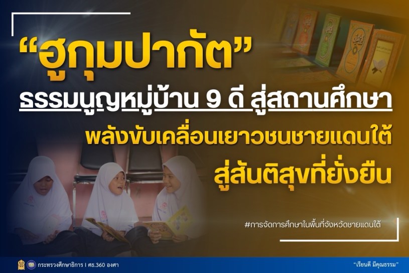 ในพื้นที่จังหวัดชายแดนภาคใต้ การพัฒนาเยาวชนให้เติบโตอย่างมีคุณภาพท่ามกลางสังคมพหุวัฒนธรรมถือเป็นภารกิจสำคัญ ล่าสุดได้มีการผลักดันแนวคิด “ฮูกุมปากัต” (ธรรมนูญหมู่บ้าน) 9 ดี เข้ามาเป็นหัวใจหลักในการบริหารจัดการศึกษา เพื่อปลูกฝังจิตสำนึกให้เยาวชน “ทำดี ละชั่ว กลัวบาป” และสร้างรากฐานชีวิตที่สมบูรณ์