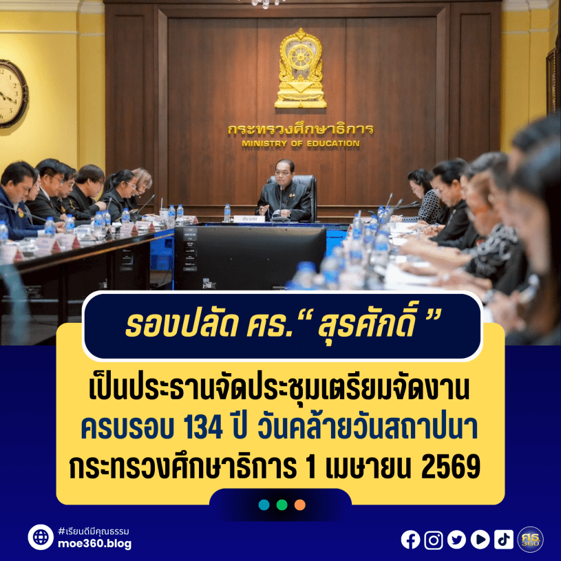 5 มีนาคม 2569 / ปลัดกระทรวงศึกษาธิการ ได้มอบหมายให้ นายสุรศักดิ์ อินศรีไกร รองปลัดกระทรวงศึกษาธิการ เป็นประธานการประชุมคณะกรรมการจัดงานวันคล้ายวันสถาปนากระทรวงศึกษาธิการ ครบรอบ 134 ปี วันที่ 1 เมษายน 2569 ณ ห้องประขุมราชวัลลภ กระทรวงศึกษาธิการโดยมีผู้บริหารระดับสูงและผู้แทนจากองค์กรหลักเข้าร่วม เพื่อเตรียมความพร้อมการจัดงานดังกล่าว