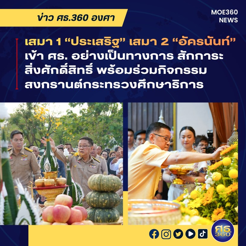กระทรวงศึกษาธิการ – 10 เมษายน 2569 / นายประเสริฐ จันทรรวงทอง รัฐมนตรีว่าการกระทรวงศึกษาธิการ พร้อมด้วยนายอัครนันท์ กัณณ์กิตตินันท์ รัฐมนตรีช่วยว่าการกระทรวงศึกษาธิการ เข้าสักการะสิ่งศักดิ์สิทธิ์ประจำกระทรวงศึกษาธิการ ได้แก่ พระพุทธรูปประจำกระทรวงศึกษาธิการ “พระพุทธบารมีศักดิ์สิทธิ์ สยามิศรจักรีสัฏฐีอนุสรณ์ ศึกษาทรรังสรรค์”, ศาลพระภูมิหรือพ่อปู่ชัยมงคล, พระบรมราชานุสาวรีย์ รัชกาลที่ 6, พระพุทธรูป (หน้า สอศ.) และศาลปู่เจียม เพื่อความเป็นสิริมงคล จากนั้นเดินทางเข้าห้องทำงานรัฐมนตรี และพบปะผู้บริหาร ศธ. ณ ห้องราชวัลลภ ชั้น 2 อาคารราชวัลลภ