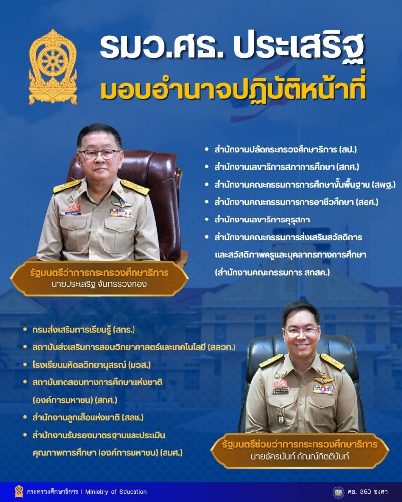 กระทรวงศึกษาธิการ – 17 เมษายน 2569 นายประเสริฐ จันทรรวงทอง รัฐมนตรีว่าการกระทรวงศึกษาธิการ ลงนามคำสั่งมอบอำนาจให้ นายอัครนันท์ กัณณ์กิตตินันท์ รัฐมนตรีช่วยว่าการกระทรวงศึกษาธิการ สั่งและปฏิบัติราชการแทน โดยให้มีอำนาจในการสั่งการ การอนุญาต การอนุมัติ การกำกับดูแล การปฏิบัติราชการแทน เพื่อให้การบริหารราชการของกระทรวงศึกษาธิการ เป็นไปด้วยความเรียบร้อย รวดเร็ว และมีประสิทธิภาพ ดังนี้