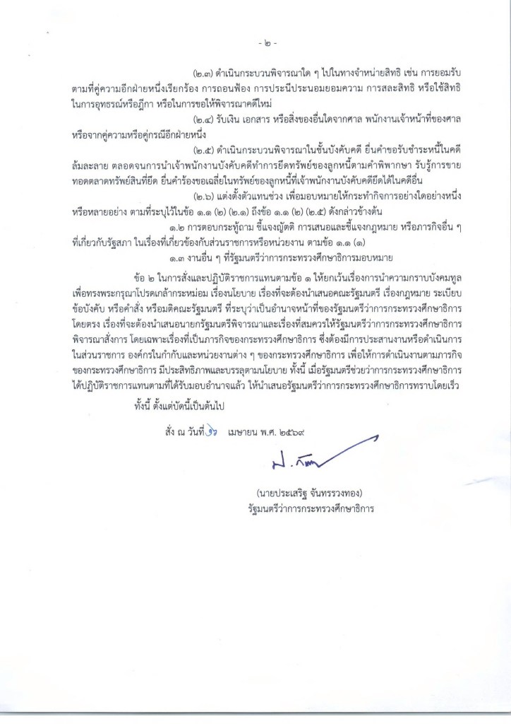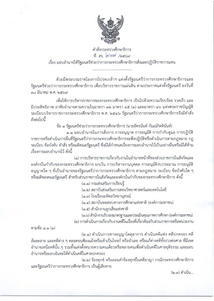 โดยให้ยกเว้นเรื่องการนำความกราบบังคมทูลเพื่อทรงพระกรุณาโปรดเกล้ากระหม่อม เรื่องนโยบาย เรื่องที่จะต้องนำเสนอคณะรัฐมนตรีเรื่องกฎหมาย ระเบียบ ข้อบังคับ หรือคำสั่ง หรือมติคณะรัฐมนตรี ที่ระบุว่าเป็นอำนาจหน้าที่ของรัฐมนตรีว่าการกระทรวงศึกษาธิการโดยตรง เรื่องที่จะต้องนำเสนอนายกรัฐมนตรีพิจารณาและเรื่องที่สมควรให้รัฐมนตรีว่าการกระทรวงศึกษาธิการพิจารณาสั่งการ โดยเฉพาะเรื่องที่เป็นการกิจของกระทรวงศึกษาธิการ ซึ่งต้องมีการประสานงานหรือดำเนินการ ในส่วนราชการ องค์กรในกำกับและหน่วยงานต่าง ๆ ของกระทรวงศึกษาธิการ เพื่อให้การดำเนินงานตามภารกิจของกระทรวงศึกษาธิการ มีประสิทธิภาพและบรรลุตามโยบาย ทั้งนี้ เมื่อรัฐมนตรีช่วยว่าการกระทรวงศึกษาธิการได้ปฏิบัติราชการแทนตามที่ได้รับมอบอำนาจแล้ว ให้นำเสนอรัฐมนตรีว่าการกระทรวงศึกษาธิการทราบโดยเร็ว