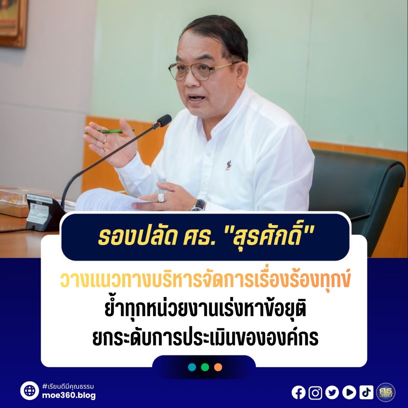 21 เมษายน 2569 / นายสุเทพ แก่งสันเทียะ ปลัดกระทรวงศึกษาธิการ มอบหมายให้ นายสุรศักดิ์ อินศรีไกร รองปลัดกระทรวงศึกษาธิการ ในฐานะผู้นำการขับเคลื่อนการดำเนินการเรื่องร้องทุกข์ประจำหน่วยงาน (Chief Complaint Executive Officer : CCEO) เป็นประธานการประชุมการบริหารจัดการเรื่องร้องทุกข์ของกระทรวงศึกษาธิการ โดยมีผู้แทนองค์กรหลักและหน่วยงานในกำกับที่เกี่ยวข้อง เข้าร่วม ณ ห้องประชุมสอาด พิมพ์สวัสดิ์ ชั้น 9 อาคารรัชมังคลาภิเษก 1