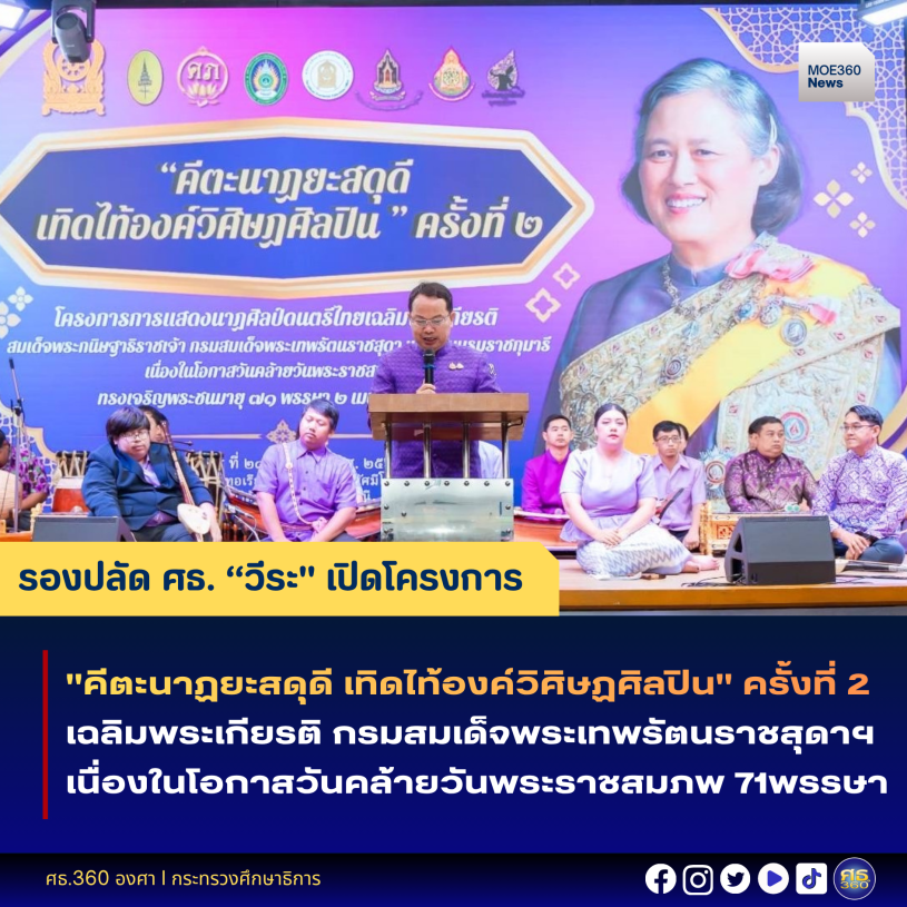 28 เมษายน 2569 – นายวีระ แข็งกสิการ รองปลัดกระทรวงศึกษาธิการ เป็นประธานเปิดโครงการ “คีตะนาฏยะสดุดีเทิดไท้องค์วิศิษฏศิลปิน” ครั้งที่ 2 การแสดงนาฏศิลป์ดนตรีไทยเฉลิมพระเกียรติ โดย ม.ร.ว.ปิยฉัตร ฉัตรชัย ถวายธูปเทียนแพ พร้อมเปิดกรวยกระทงดอกไม้ เบื้องหน้าพระฉายาลักษณ์ และนำกล่าวถวายพระพรชัยมงคล ซึ่งนายโชคดีศรัทธากาล ศึกษาธิการจังหวัดสุราษฎร์ธานี อ่านสารปลัดกระทรวงศึกษาธิการ ณ ห้องออดิทอเรี่ยม ตึกทีปังกรรัศมีโชติ มหาวิทยาลัยราชภัฏสุราษฎร์ธานี