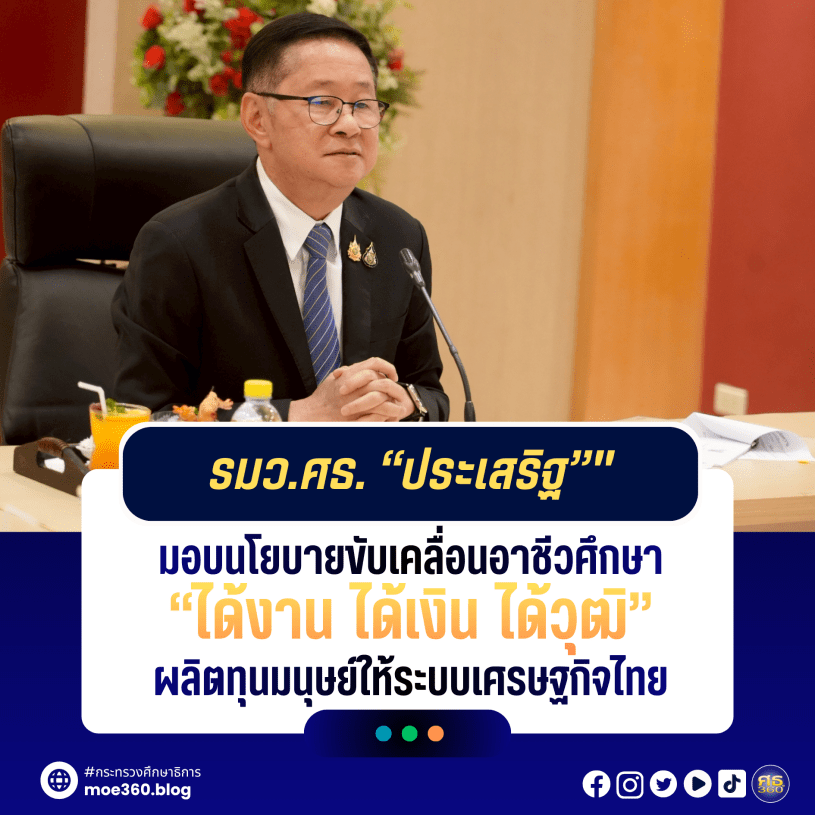 29 เมษายน 2569 – นายประเสริฐ จันทรรวงทอง รัฐมนตรีว่าการกระทรวงศึกษาธิการ มอบนโยบายขับเคลื่อนการอาชีวศึกษา โดยนายสุเทพ แก่งสันเทียะ ปลัด ศธ. นายพิเชฐ โพธิภักดี เลขาธิการ กพฐ. นายยศพล เวณุโกเศศ เลขาธิการ กอศ. นายประวิต เอราวรรณ์ เลขาธิการ สกศ. ผู้บริหารระดับสูง และผู้ทรวงคุณวุฒิจากหน่วยงานที่เกี่ยวข้อง เข้าร่วม ณ ห้องประชุม 5 สำนักงานคณะกรรมการการอาชีวศึกษา และผ่านระบบออนไลน์