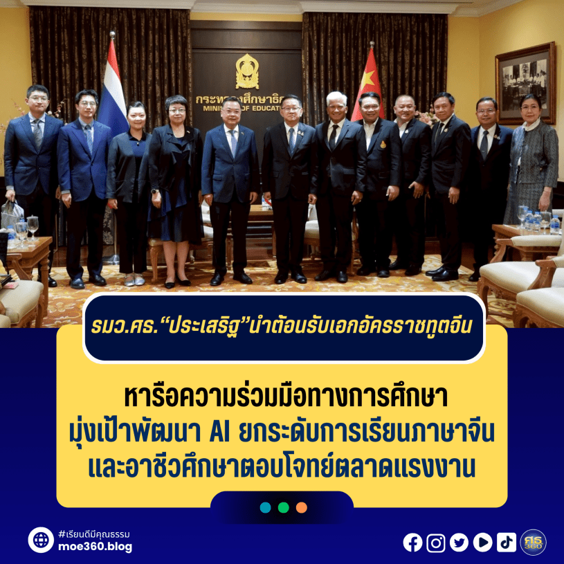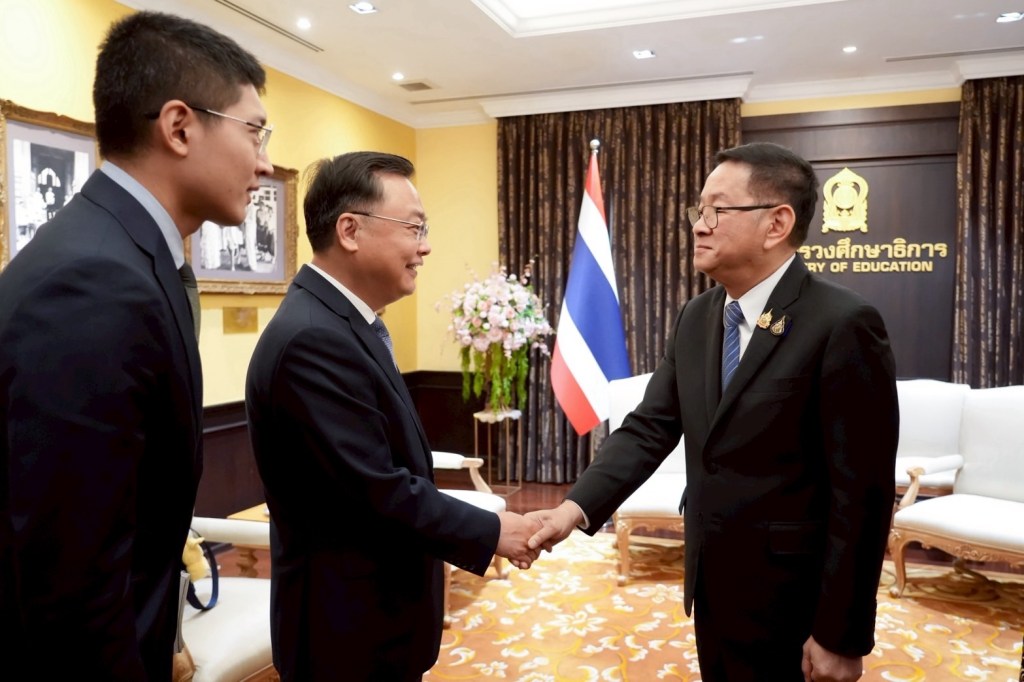 รัฐมนตรีว่าการกระทรวงศึกษาธิการกล่าวต้อนรับเอกอัครราชทูตจีน พร้อมเน้นย้ำความสัมพันธ์ “ไทย-จีน ใช่อื่นไกล พี่น้องกัน” อันแน่นแฟ้น และเมื่อปี 2568 ถือเป็นปีมหามงคลในโอกาสครบรอบ 50 ปี การสถาปนาความสัมพันธ์ทางการทูตไทย – จีน สะท้อนถึงความร่วมมืออันยาวนานในหลายมิติ โดยเฉพาะด้านการศึกษา โดยกระทรวงศึกษาธิการมีนโยบาย ๕ ด้านหลัก ได้แก่ ๑) ลดความเหลื่อมล้ำทางการศึกษา ระหว่างพื้นที่เมืองและชนบท ๒) ลดภาระครู เพื่อให้ครูมุ่งเน้นการเรียนการสอน ๓) ปรับปรุงหลักสูตร ให้สอดคล้องกับการเปลี่ยนแปลงของเทคโนโลยีและตลาดแรงงาน (เช่น AI และ EV) ๔) เสริมสร้างความปลอดภัยในสถานศึกษา ทั้งด้านโครงสร้างพื้นฐานและการใช้เทคโนโลยี ๕) ปรับปรุงกฎหมายการศึกษา เพื่อยกระดับระบบการศึกษาไทยสู่มาตรฐานสากล ทั้งนี้ เพื่อให้เกิดความสอดคล้องกับนโยบายดังกล่าว จึงมีความประสงค์เสนอให้ฝ่ายจีนพิจารณาขยายความร่วมมือด้านการศึกษาขั้นพื้นฐานและการอาชีวศึกษา โดยเฉพาะการขยายสถาบันและห้องเรียนขงจื่อ การพัฒนาด้านการศึกษา AI การพัฒนานักเรียนนักศึกษาอาชีวศึกษาให้มีทักษะตอบโจทย์ตลาดแรงงานในโลกที่มีการเปลี่ยนแปลงทางภูมิรัฐศาสตร์และด้านเทคโนโลยีที่รวดเร็ว